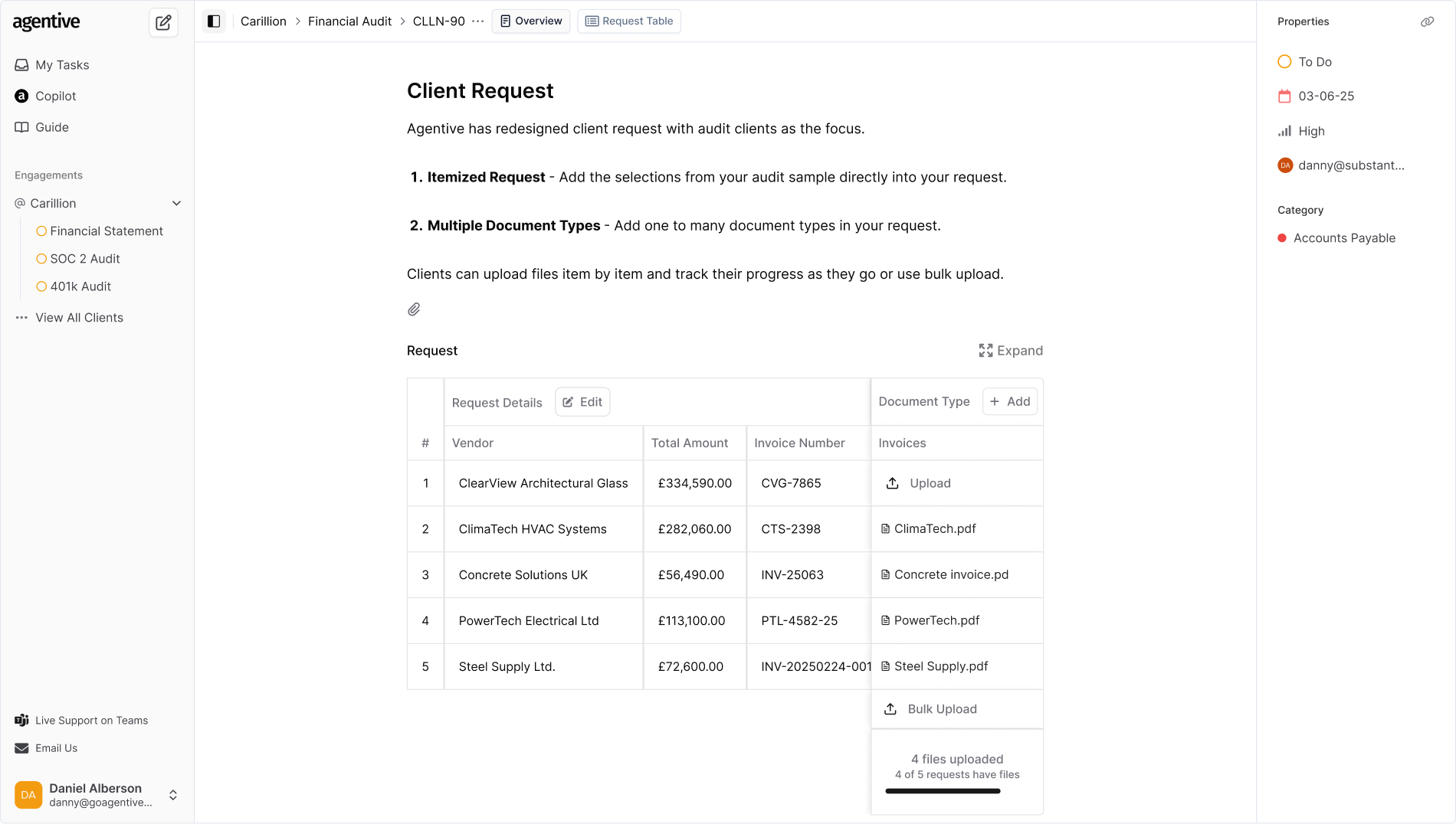 Audit document requests (PBC lists) are confusing to clients, disorganized when uploaded, and takes days or weeks for auditors to review. Clients need training to navigate the interface and often make mistakes because sample requests are disorganized, leading to 25% of the work being redone. Auditors spend their time trying to match the files clients uploaded to the actual item they're testing and following up with clients and straining the relationship.